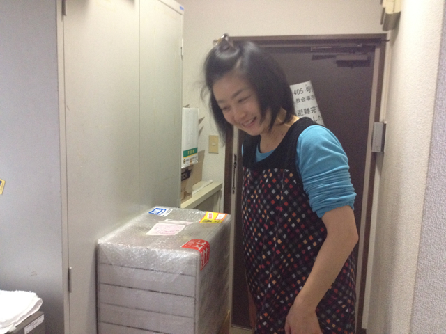 事務所に来た山中さんと差し入れの箱を前に密談。 つまみ食いしようか?(笑)