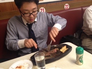 沖縄のステーキはサイコーですとヨハネくん。
