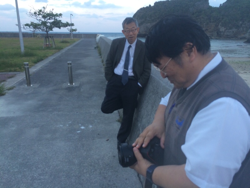 浜比嘉島で、クワッドコプター、飛ばします! その前に永藤さん、アンテオケの5Dカメラに手をおいてます、 怪しいです(^^) 5Dカメラ、死守します!