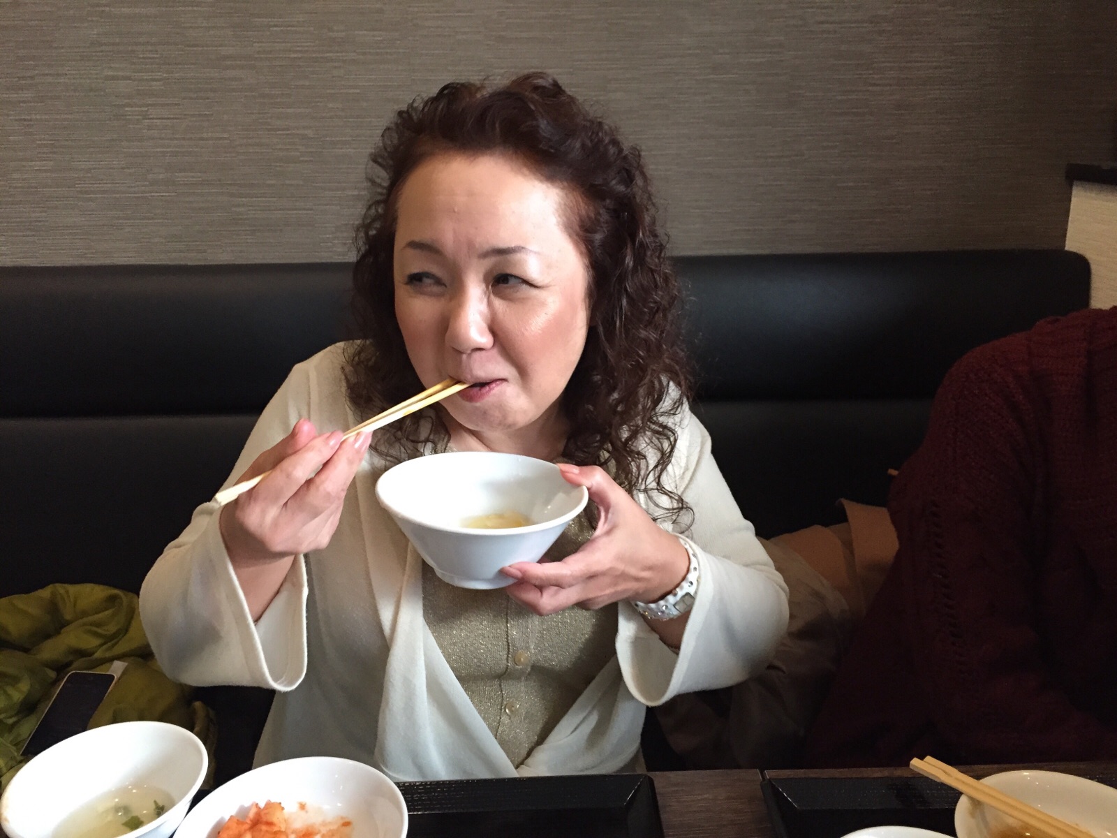 真理子さん、どんぶりでデザートを食べています。