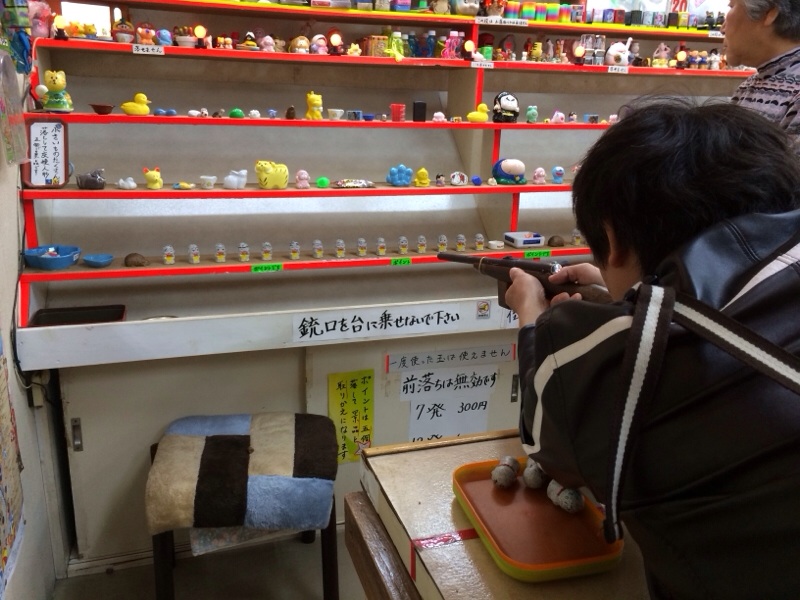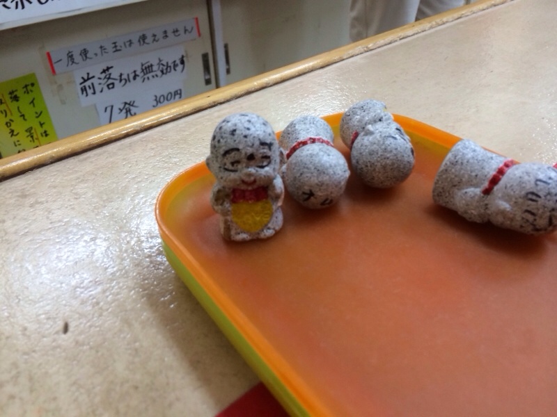 この射的!お地蔵様を打った数だけ、景品と交換です。パパ!7個!7個!と息子。