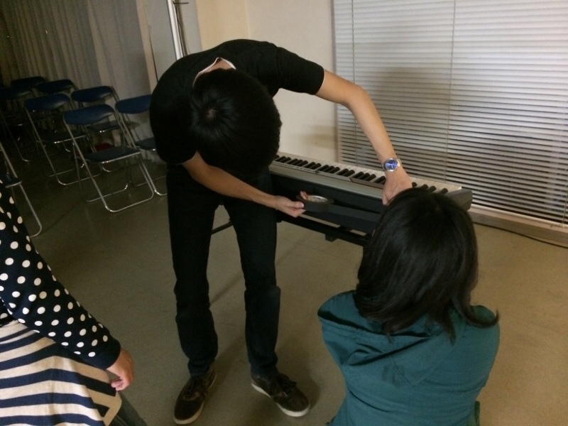 ピアノをセッティングしています。 メーカー名をテープで隠しているところです。 Gospel Seed 会堂にて
