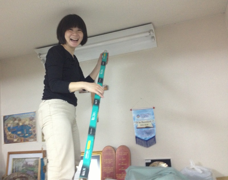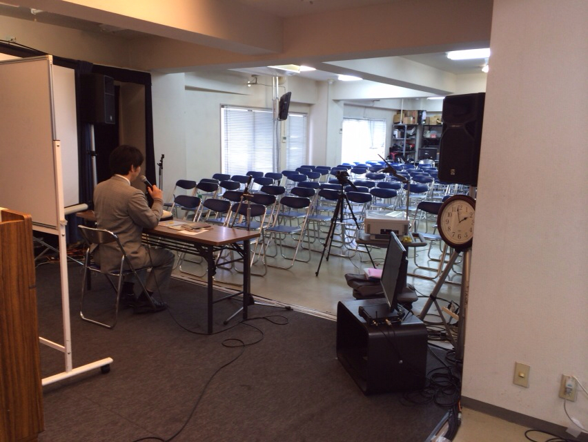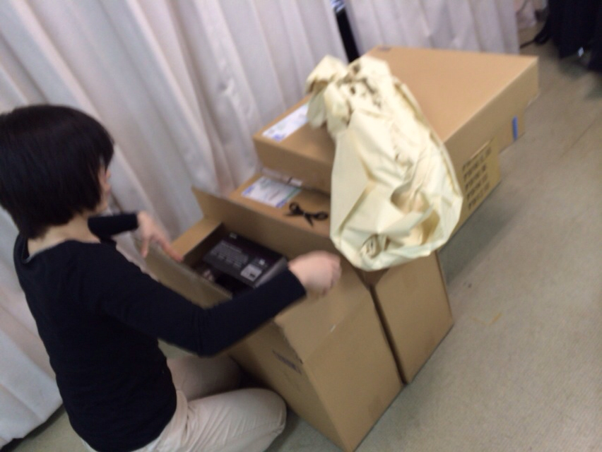 会堂に機材が届いています。 苫米地愛ちゃんが開けています。