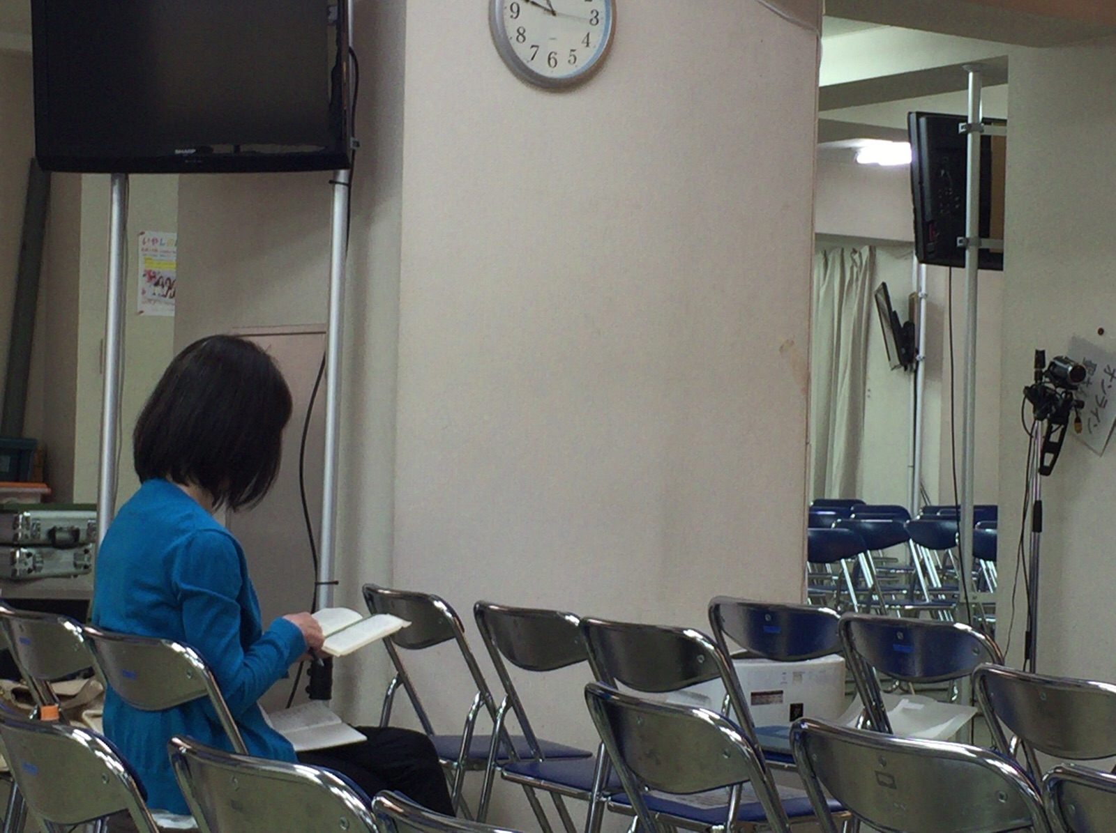 木曜礼拝、そして今日は金曜礼拝のご奉仕をされている千多さん。聖書を開いていらっしゃいます。柱の向こう側でもお二人の方々が共に礼拝を♫