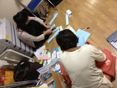 〈写真は、券に、切り取り線を入れるためのルーラーを買って来てくれた小代さん〉