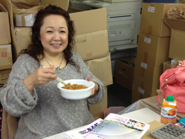 月刊誌の発送作業が一段落し、marikoさんが登場。 遅いお昼ごはんの焼きそばがよい匂いです。