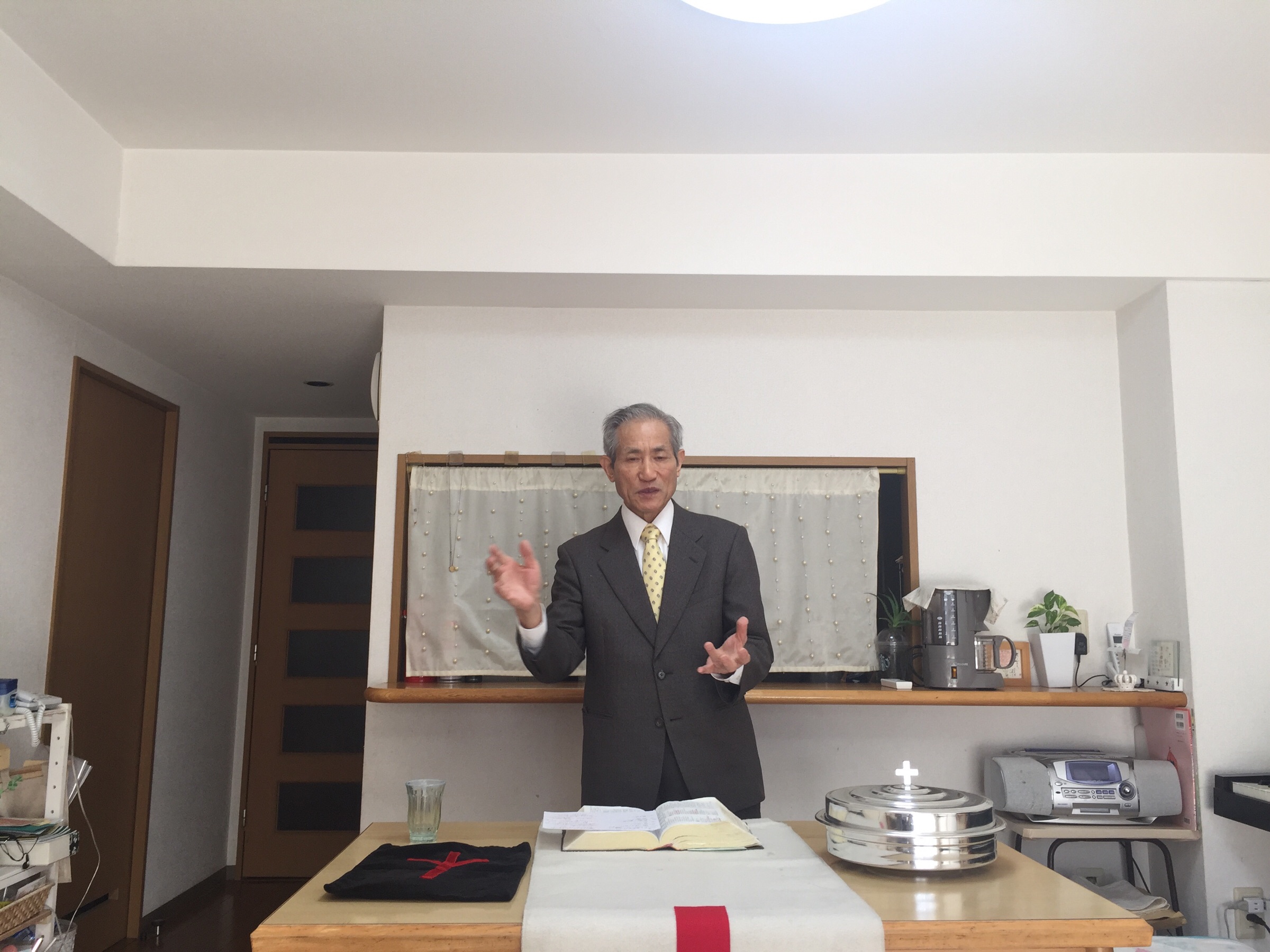 今日も熱くメッセージ中♫ 出発前の準備も重なって?忙しかったのか?髪が…乱れているような? 大和教会 hannah.t