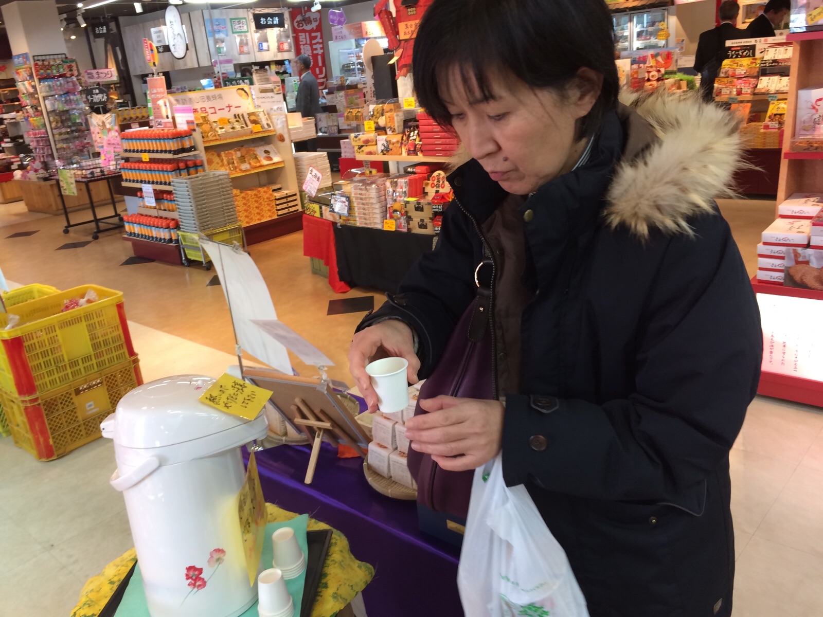 駒ケ岳SAにてごぼう茶を試飲するOさん(^-^) 兵庫N