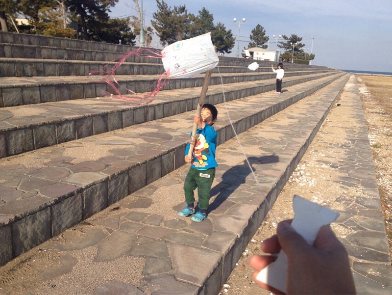ゆいちゃんも懸命に凧をあげています。 ますかわ