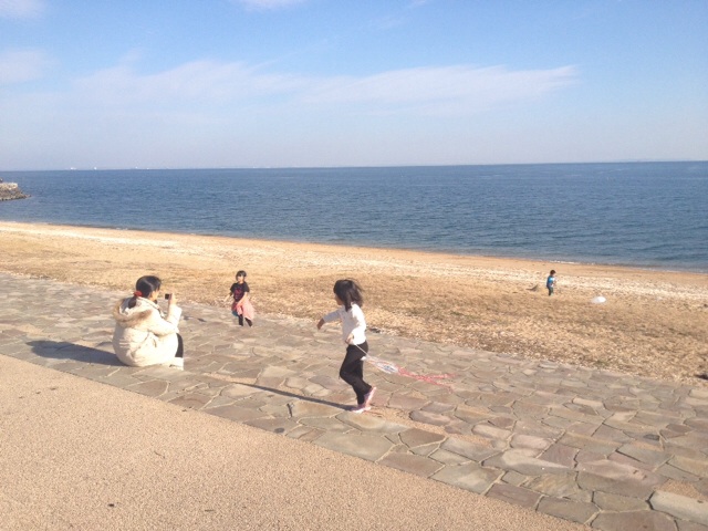 天気がよく、暖かなので、海に来てみんなで凧上げをします。 ますかわ