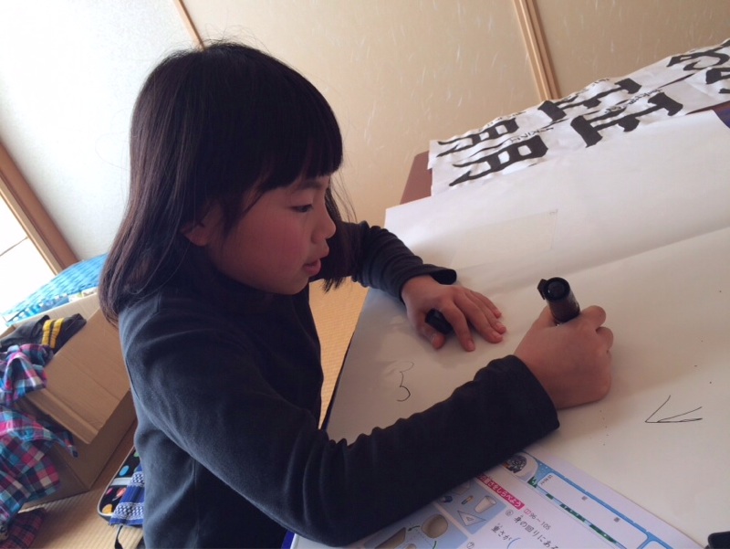 書き初め、名前を書いてようやく仕上げた娘! 次は、お絵かきへ。 プラスチックの板に絵を書いてキーホルダー作りです! 帰省先三重にて まじきな