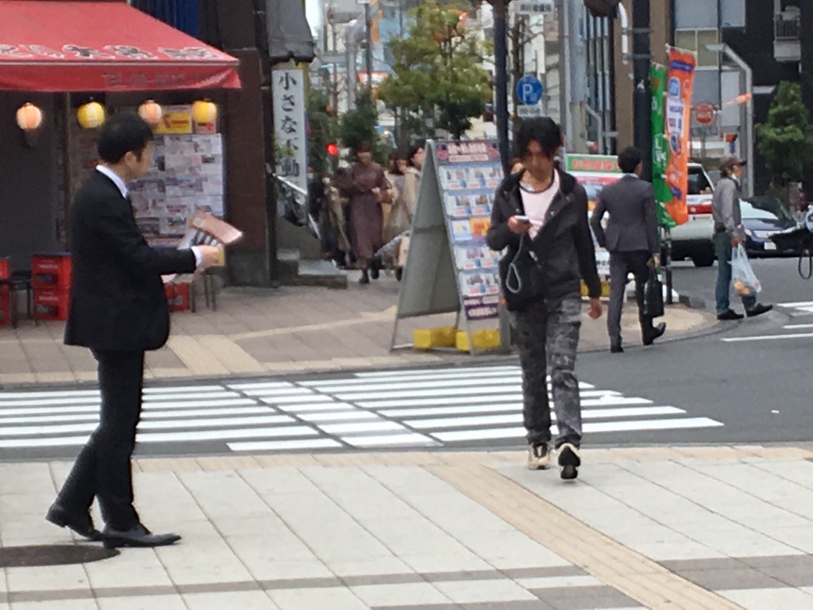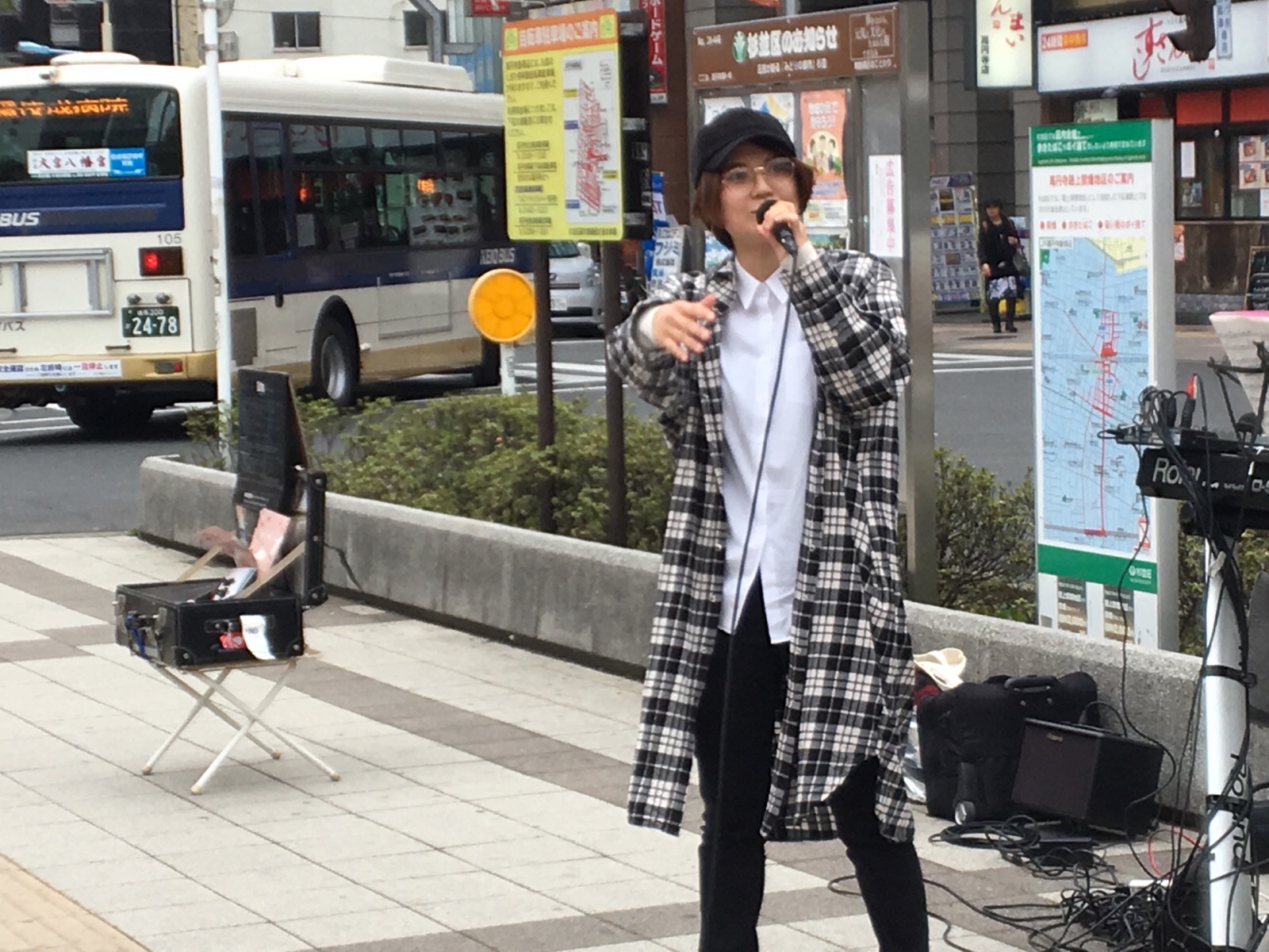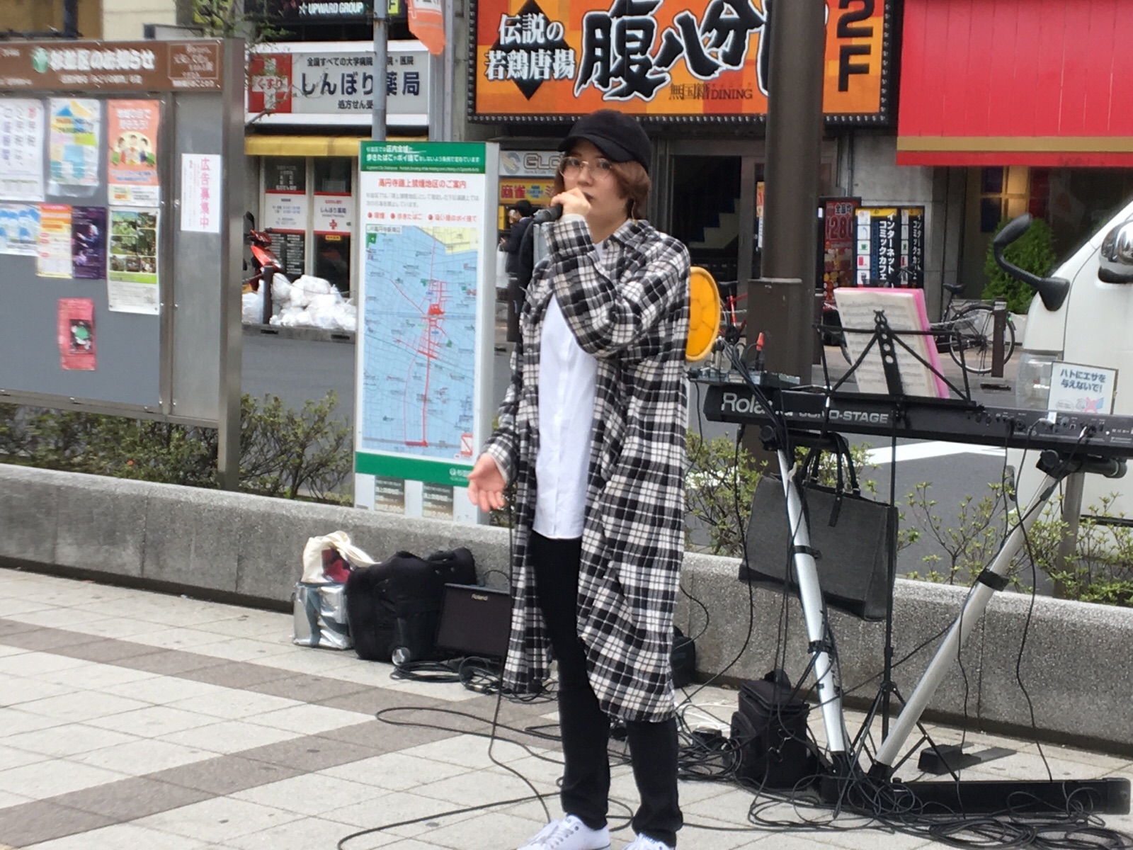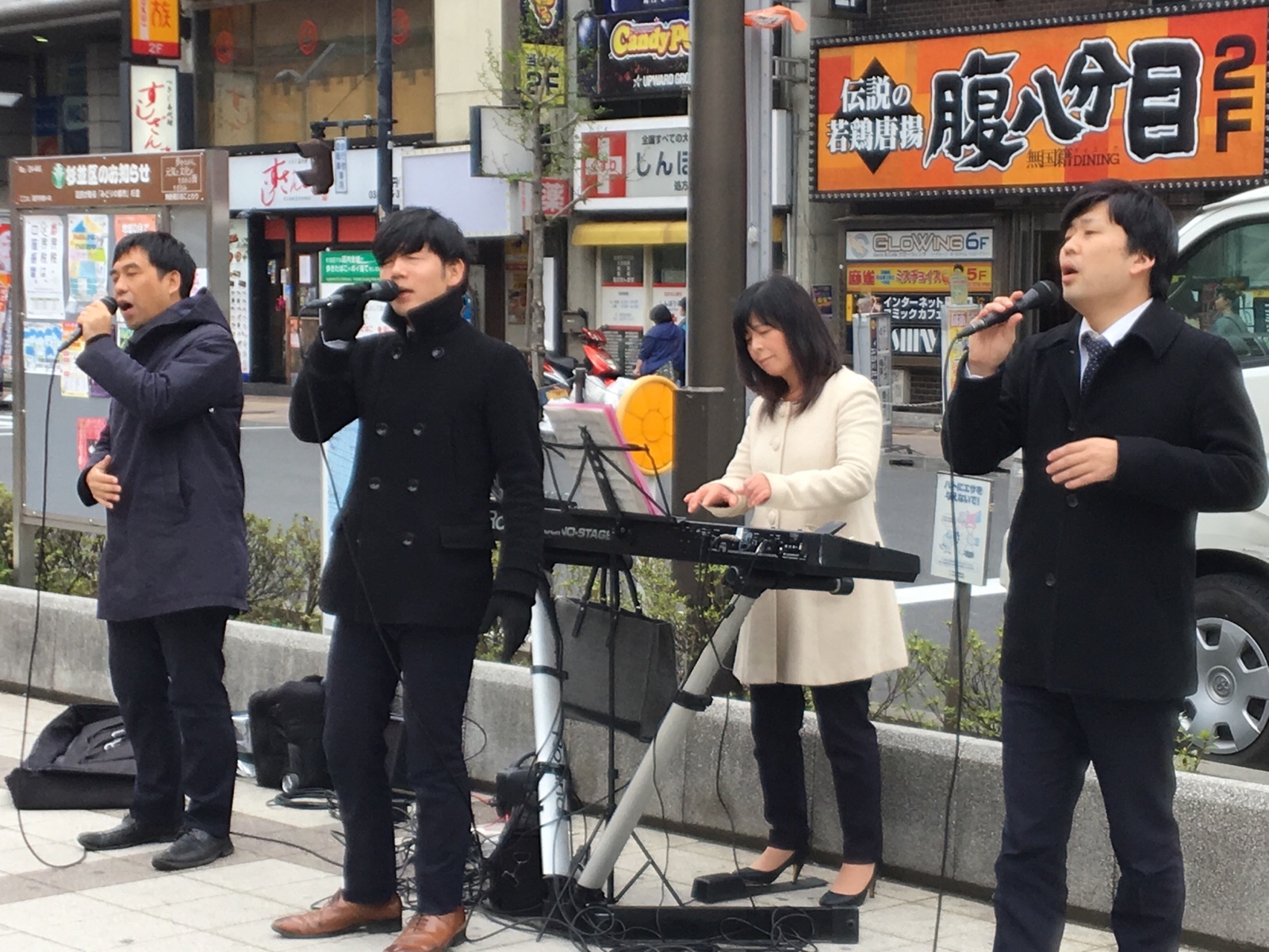 こころごすぺる宣伝路上ライブとチラシ配りを高円寺南口広場で行なっています。 賛美隊Giftsの皆さんです。目の前にはベンチに色々な方々が座って聞いてくださっています。