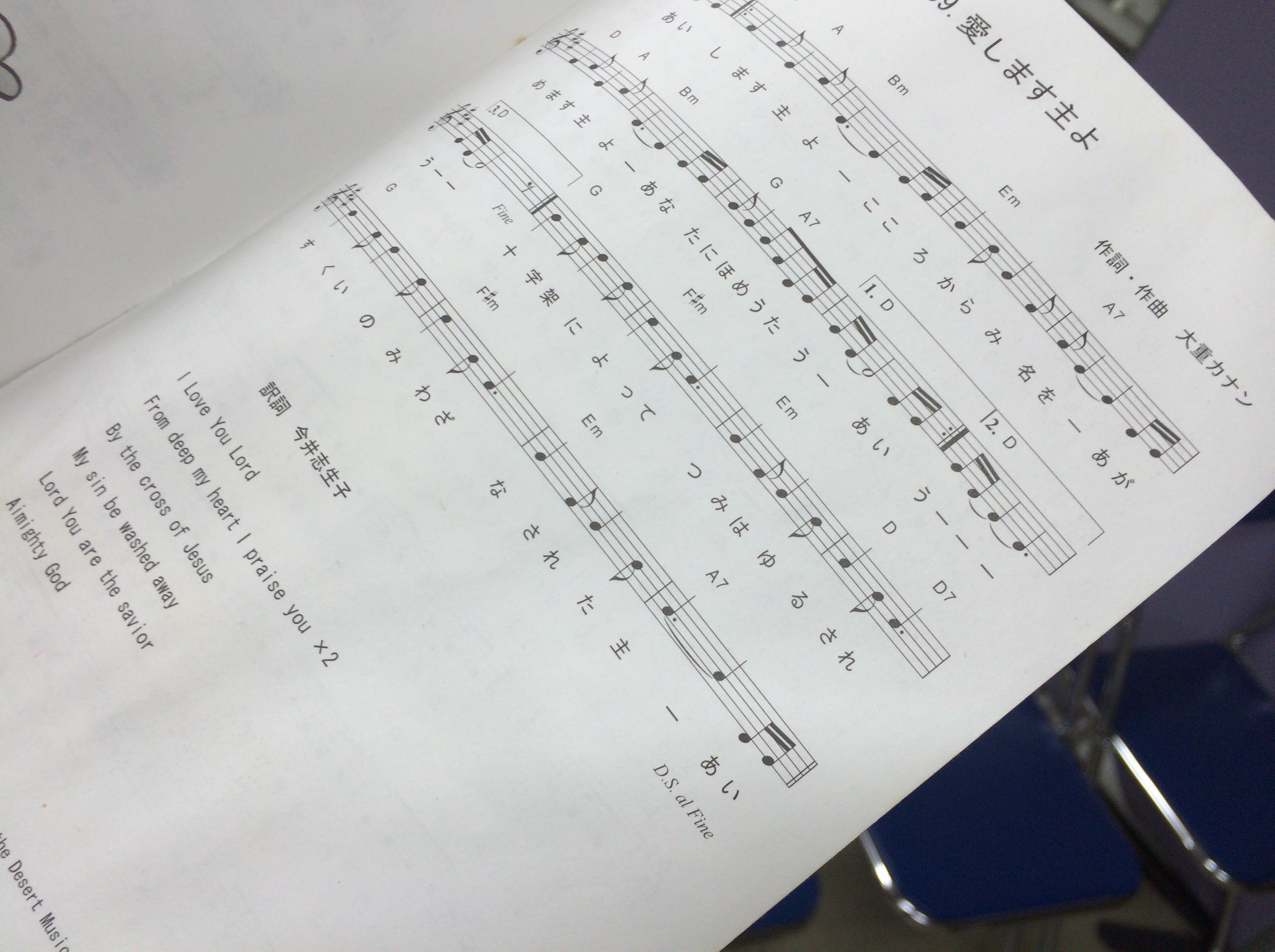 英会話の授業で使うのは、カナンさん作詞作曲の「愛します主よ」 しおこさんが英訳です! meg