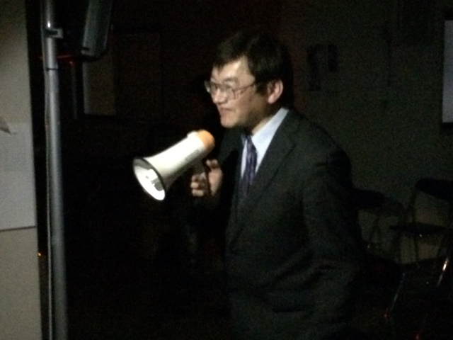 地震が起こり、パニックになってる人が! もちろん益川さんの演技ですけど。
