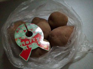職場の女の子からおいも頂きました♪ 毎日食べてるので助かります(^-^) なぜか、MerryXmas~ついてました…。 札幌 シャイン