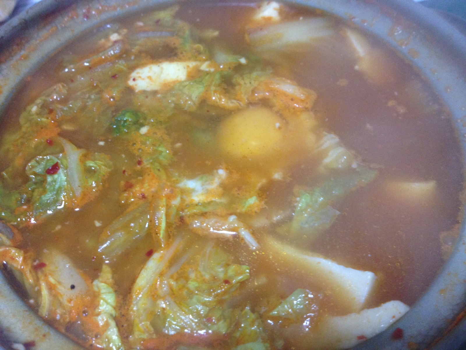 夕べは、朝の鍋の残りのスープに市販のスンドゥブチゲスープの素を入れてスンドゥブチゲ鍋にしました。具は豆腐、白菜、卵。 見た目より辛くてとても温まりました。 kato