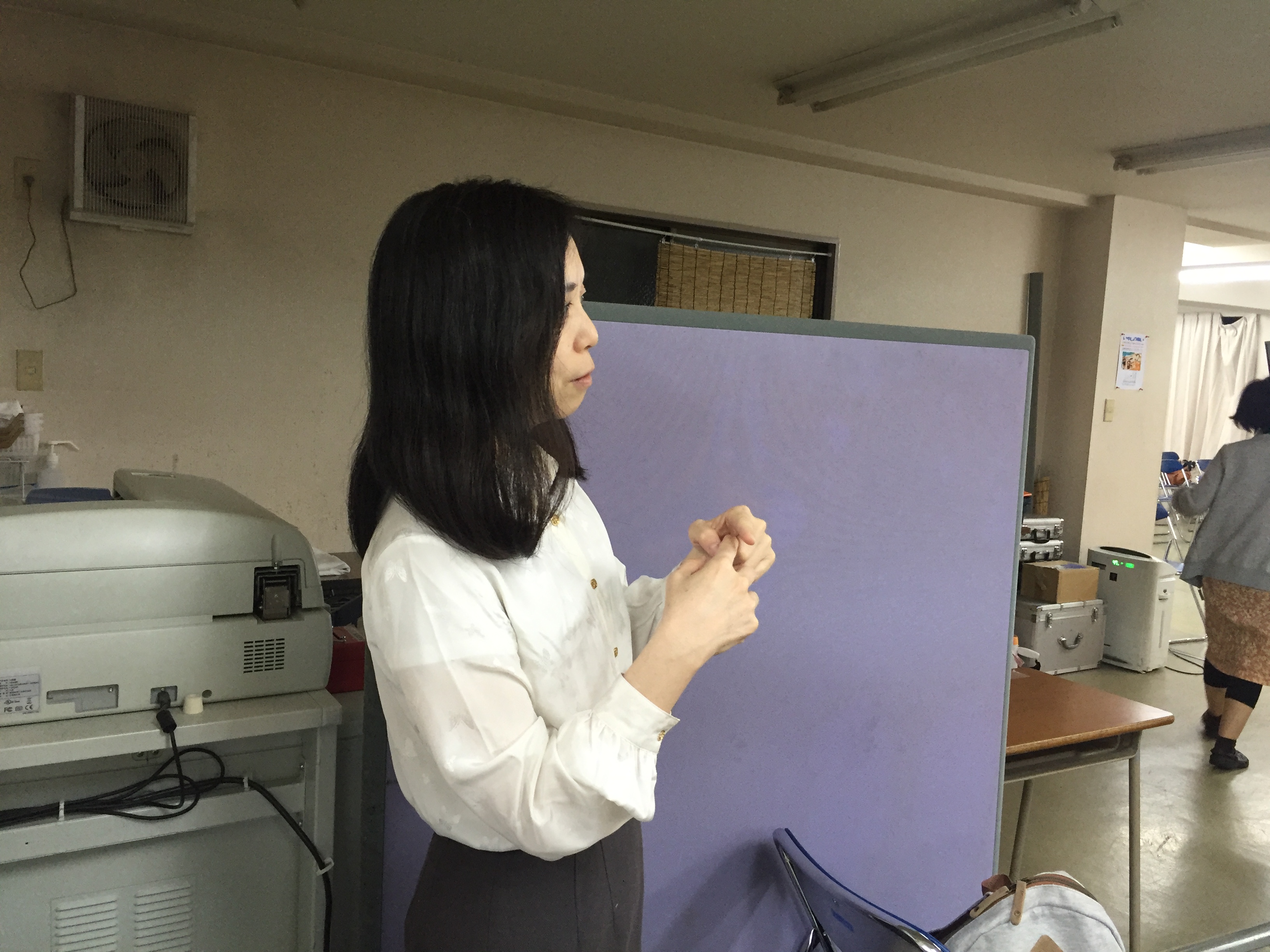 小林さんが今日の避難訓練についてどのようにするべきか話しています。