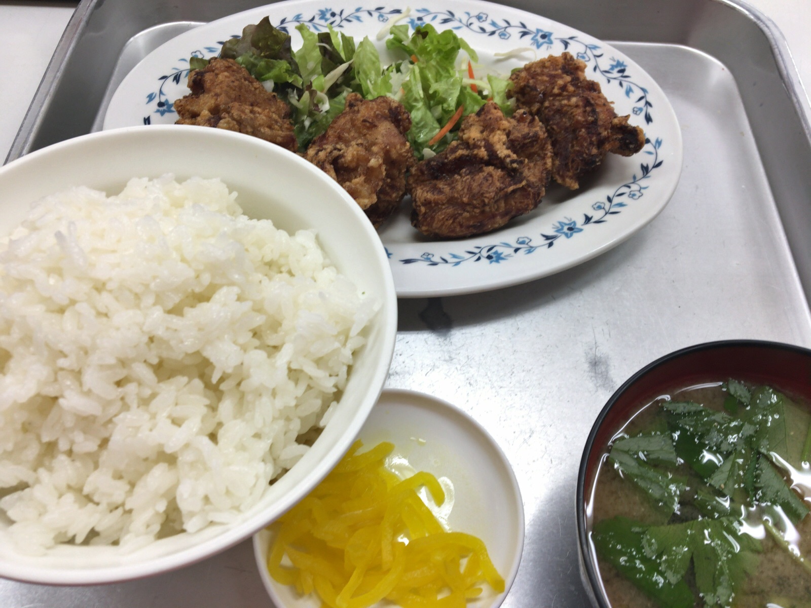 お昼に食べた唐揚げ定食。美味しかったです。肉汁が熱すぎて口の中を火傷しました。 Yui