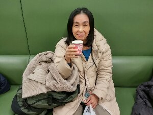 空港の待ち合い室で松本さんとばったり! 同じ便で成田空港までご一緒です。