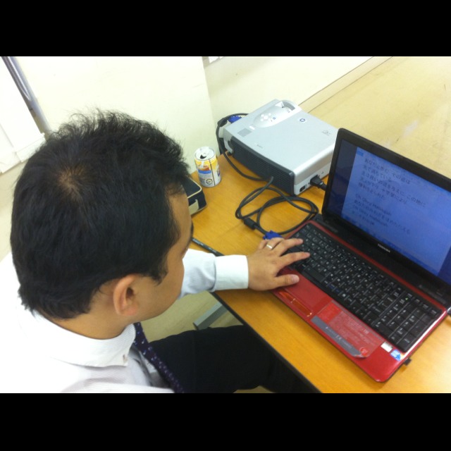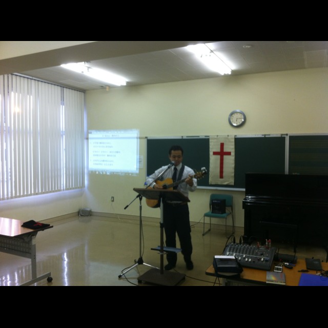 休憩中にパウロ秋元牧師の賛美の準備中です。