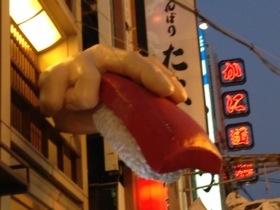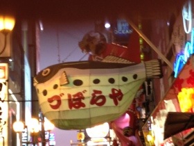大阪は派手な看板がいっぱいあります(^◇^;)少しずつ紹介。 まずはふぐちょうちん。ユラユラゆれてます〜