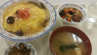 今日のお昼は社員食堂で日替わりにしました☆ 天津飯(^-^) 小鉢は好きなものを選べます♪