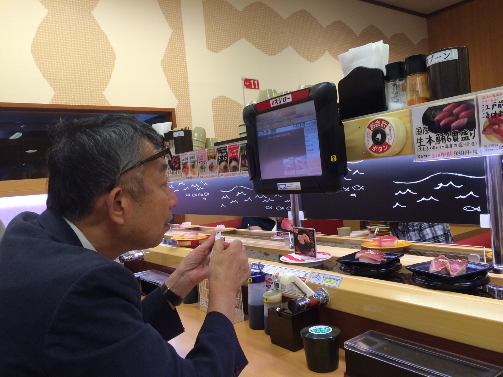 慣れた手つきでタッチパネルをそうさするパウロ秋元さんです。 john