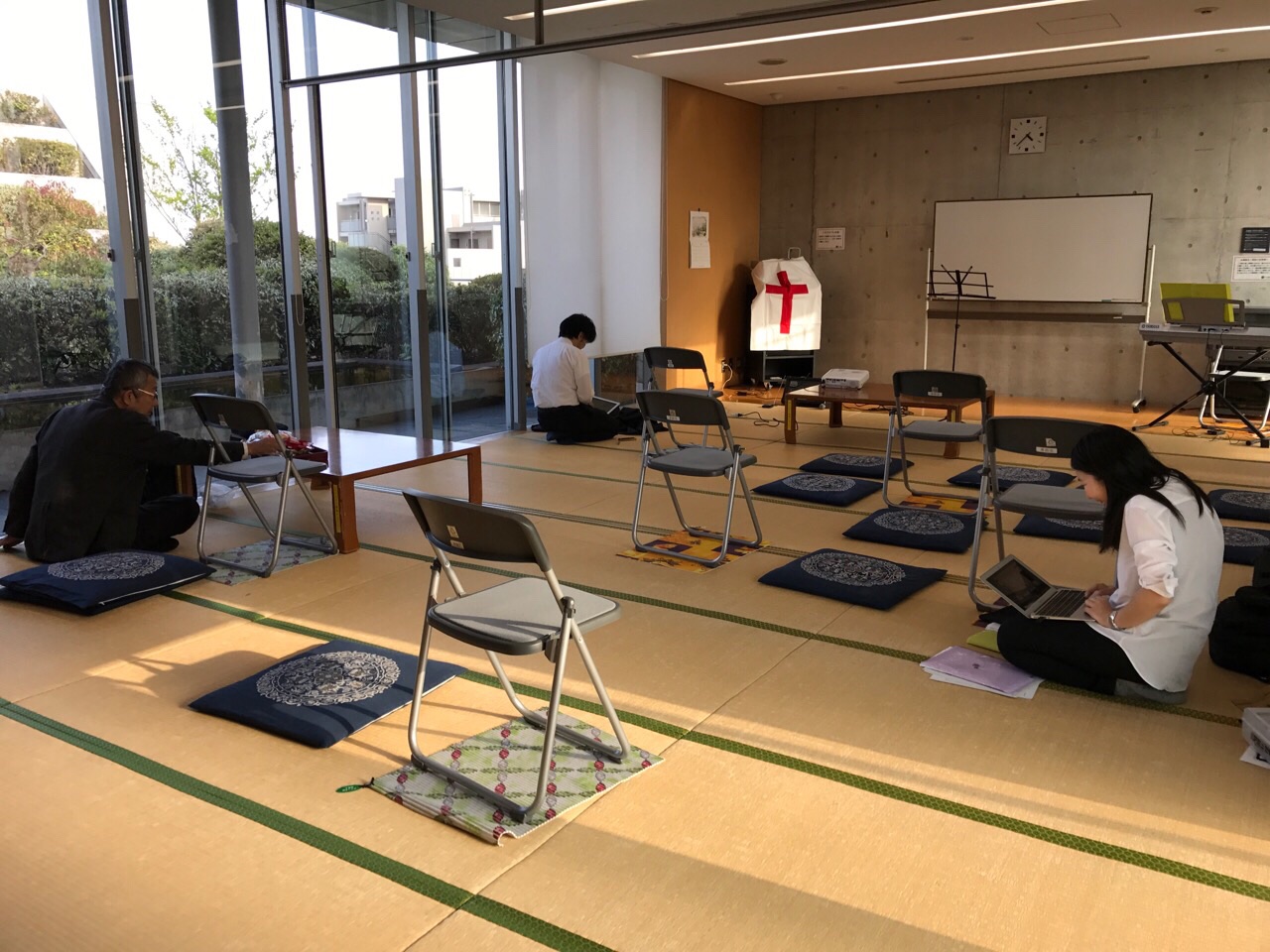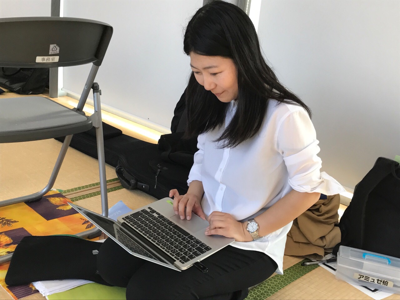 あゆみちゃんも無事到着!早速パソコンで賛美準備に取り掛かっています。 ハンナ