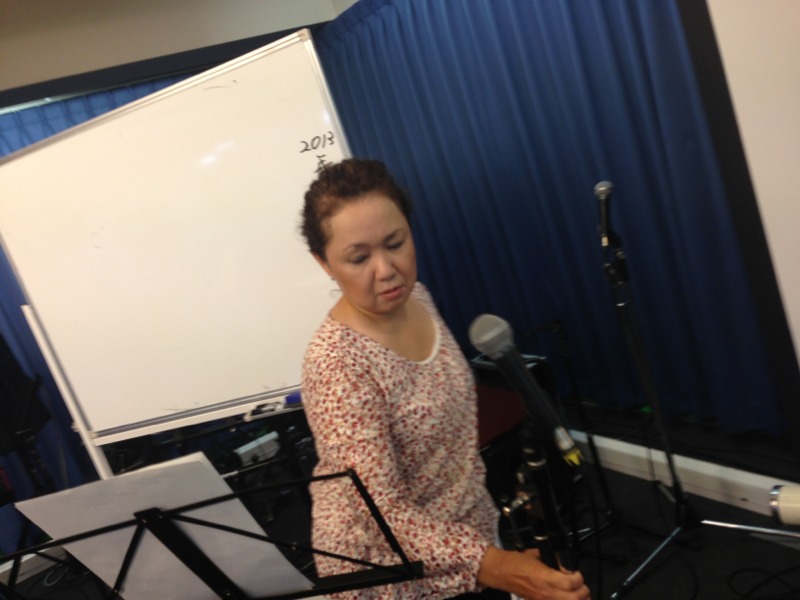 マイクチェック!マイクに向かいアッ!また歩いてアッ!マイクは赤と黒やけぇ。とわかった感じでマイクチェック中のエルサレムの真理子さん。