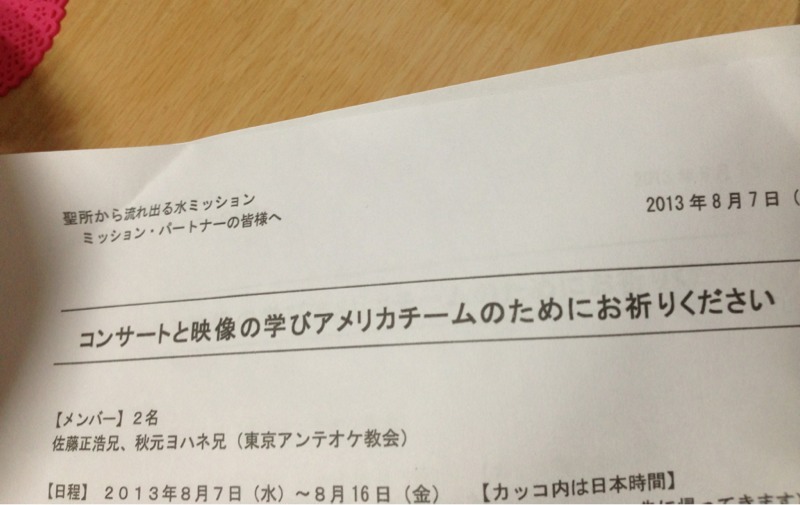 コンサートと映像の学びアメリカチームのための祈りの課題が教会の受付においてあります。企画製作、プロデューサーの佐藤伝道師とプランナーのヨハネさんがそれぞれの日程で遣わされています!