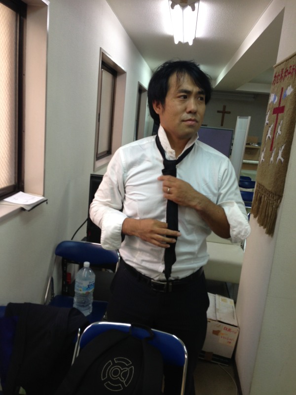 早天祈祷後自転車を飛ばして到着。ネクタイ失礼いたします。
