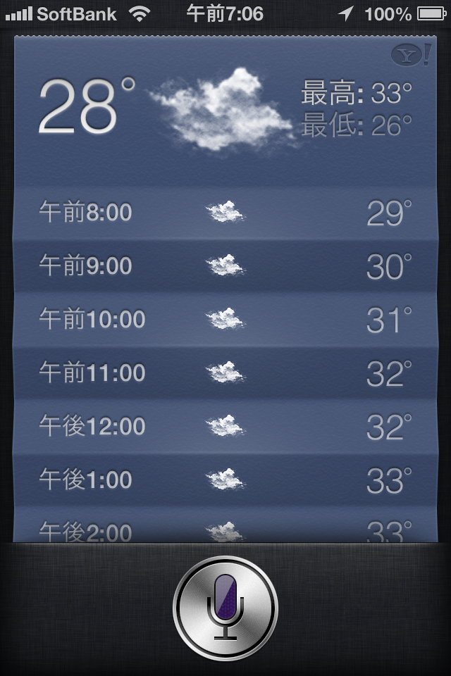 Siriさんに今日の天気を聞きました。曇りだそうです。少し暑さもやわらぐかな?