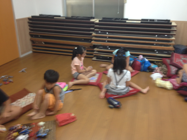 お昼前。二丁目会館を訪問。 子どもたちと託児のご奉仕の皆さん。