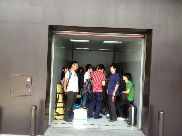 この“デカ”エレベーター! 機材と人をいっきにステージ階に運ぶすぐれもの(^^)