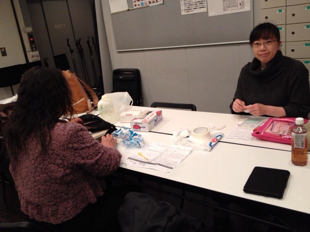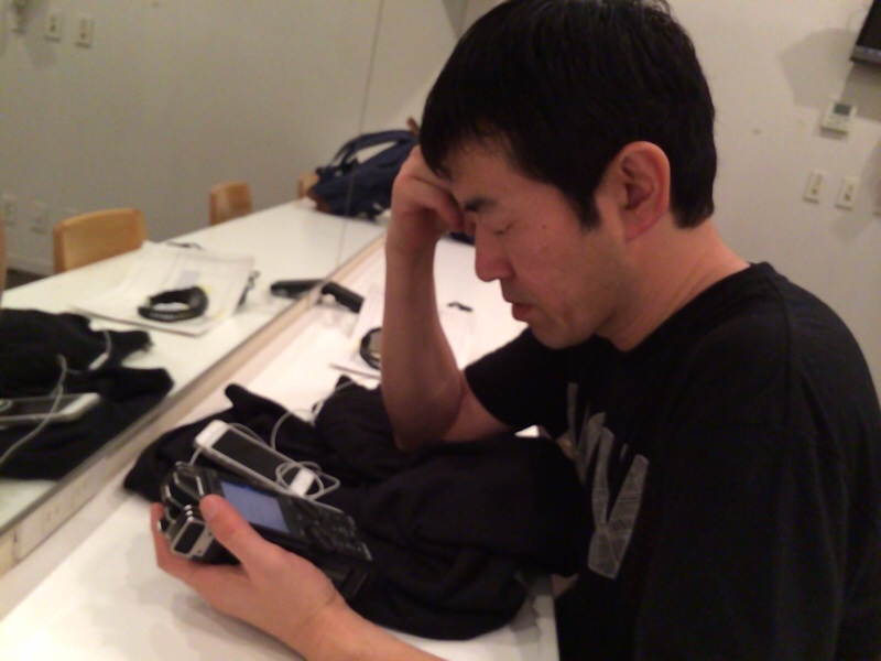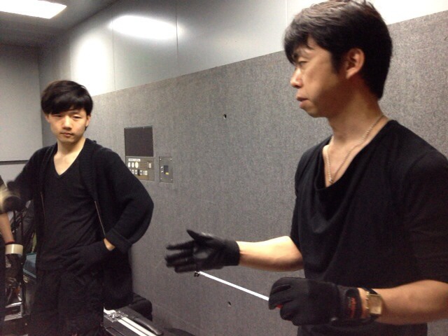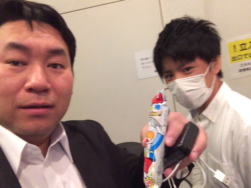 控え室にて、佐藤さんと映像に使うナレーションの撮り直しをしています!