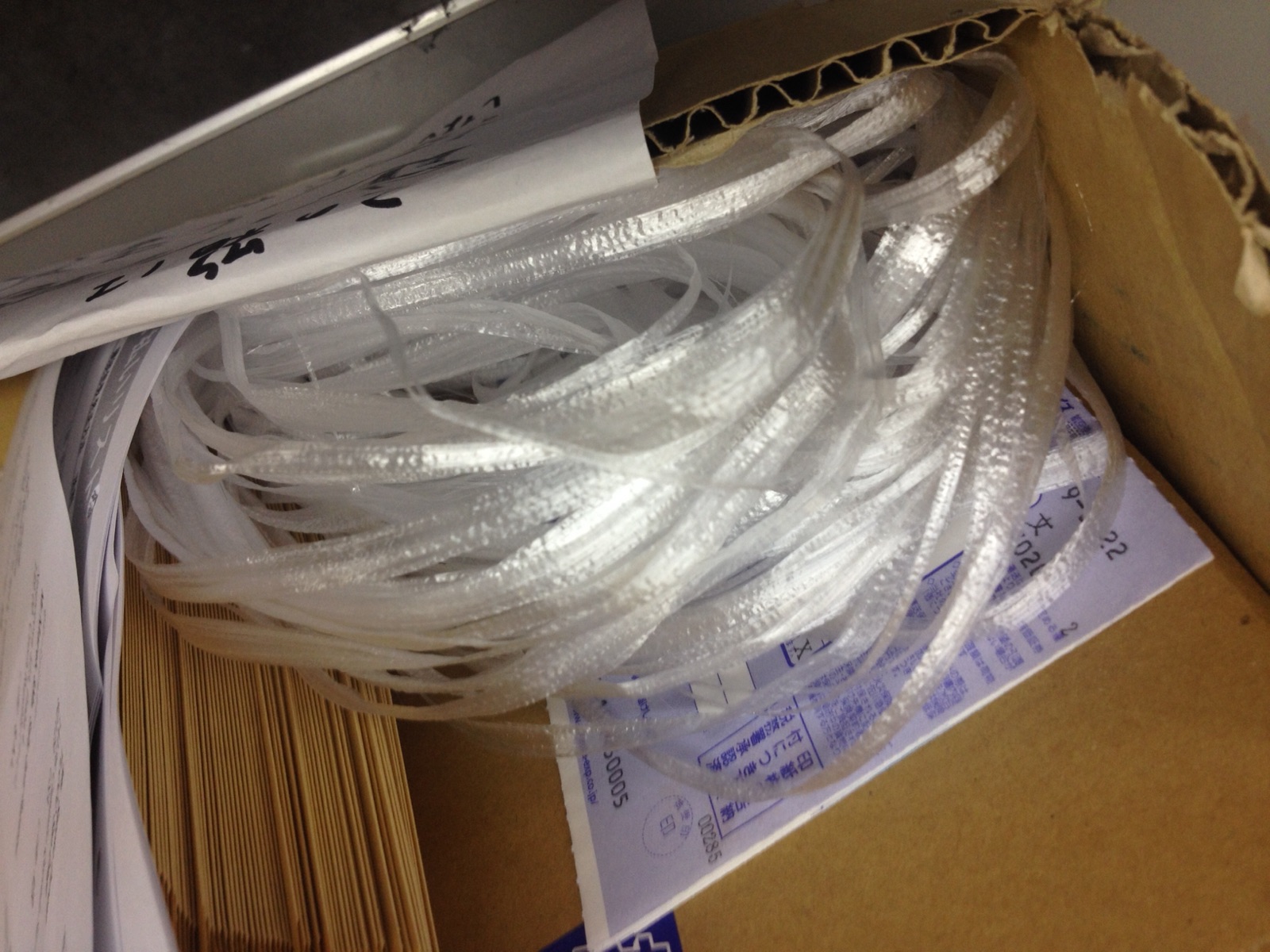 土屋さんが用意してくれたひも。 第3種郵便物は、同じ上2桁の番号ごとにひもでくくって差し出します。 事前にひもを用意しておくと手早くできます。 kato