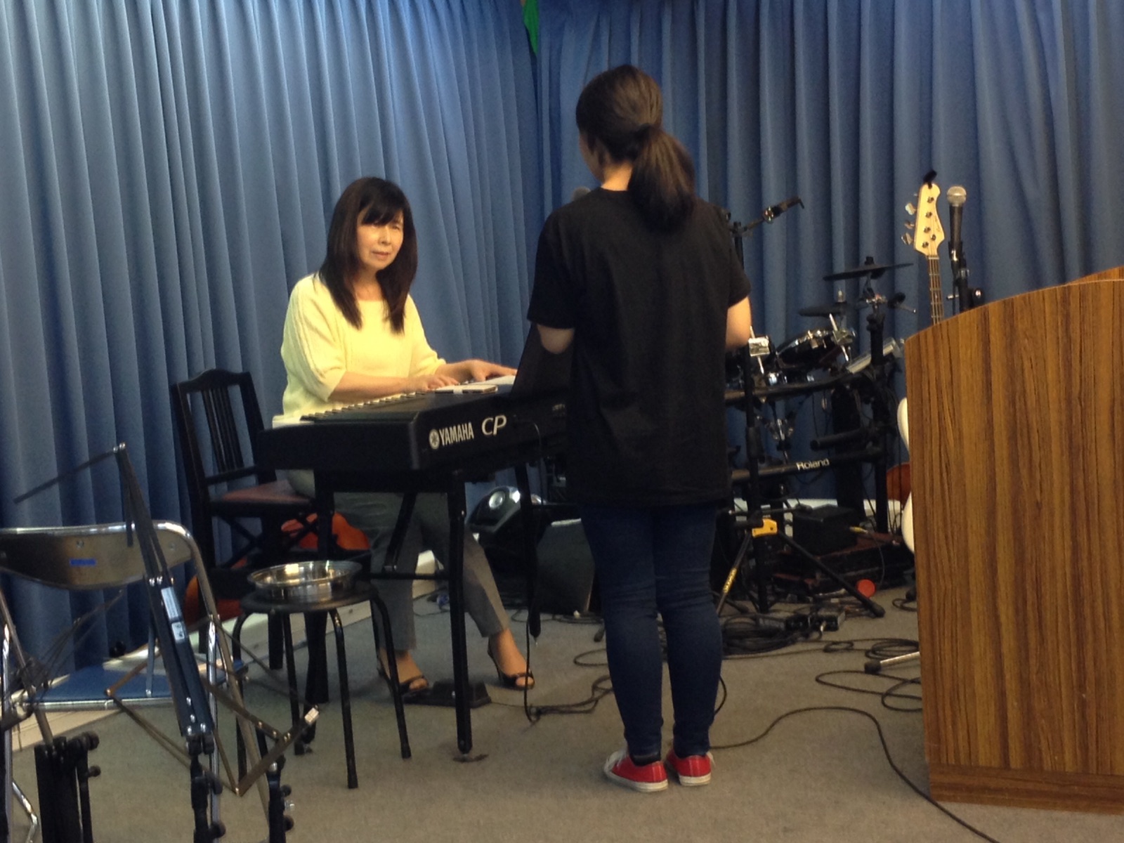 萱野さんと祈りちゃん、レッスンしています。祈りちゃん、「戻り橋」を賛美しています。 kato