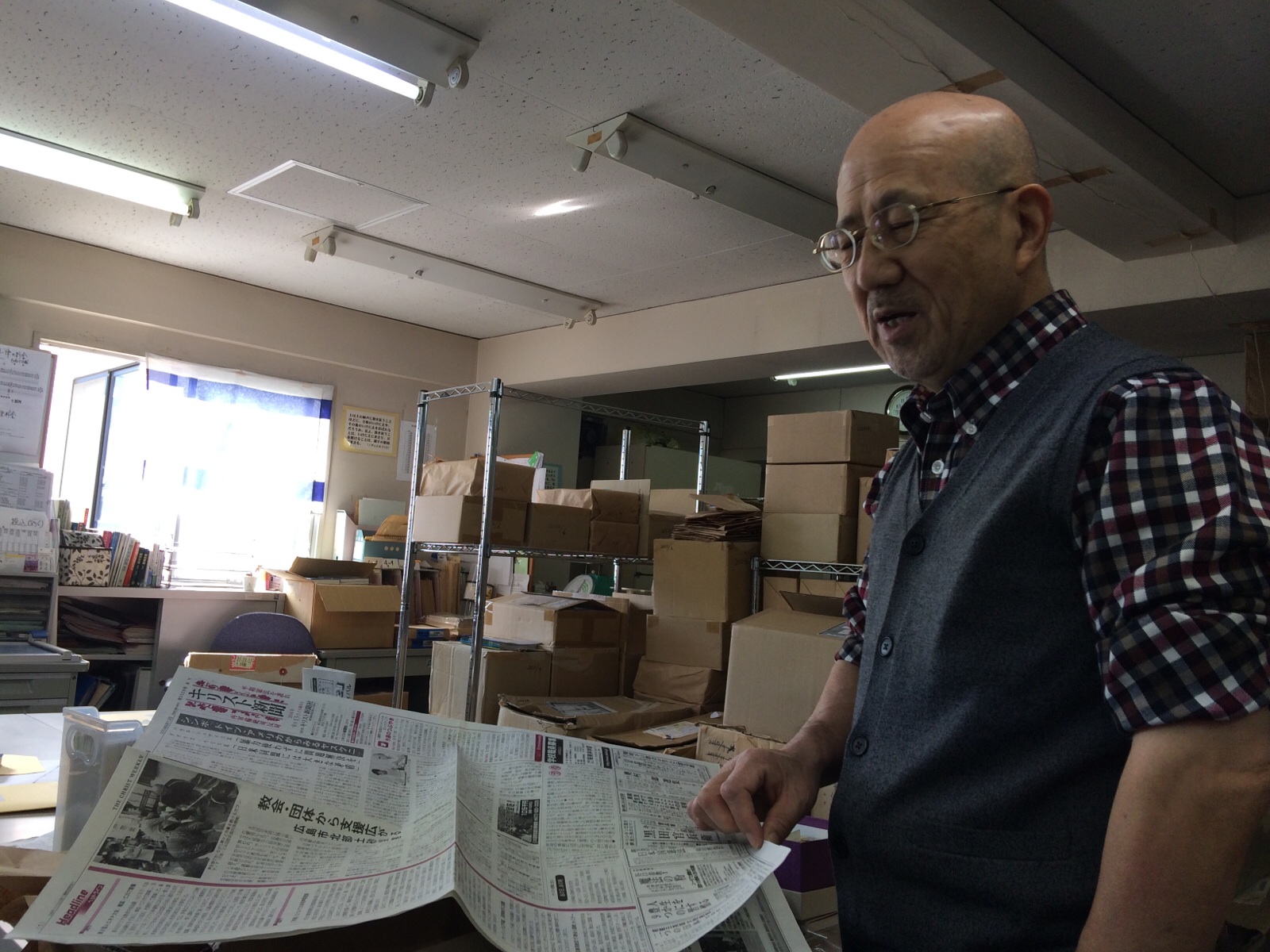 モーセ鈴木さん、新聞見て、にっこり。