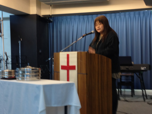 小野島さん。 イスラエルで見た虹や賛美のご奉仕のお話をされています。