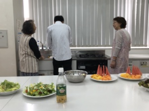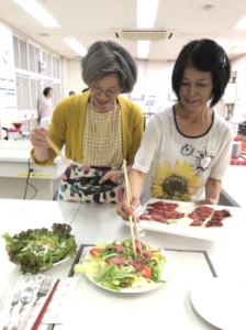 サラダにローストビーフを添えるたえこ&神崎