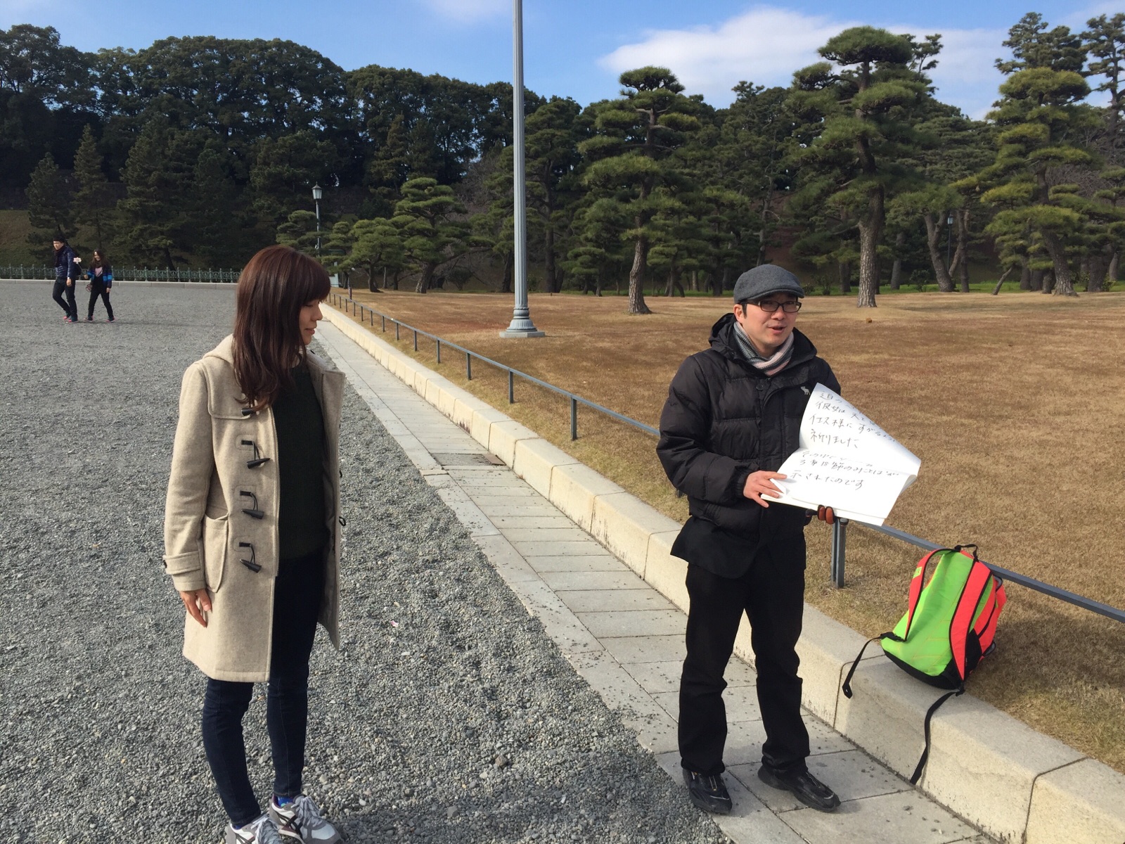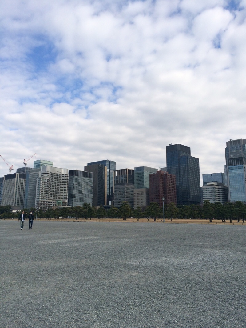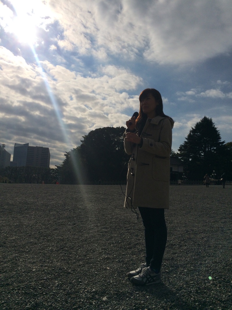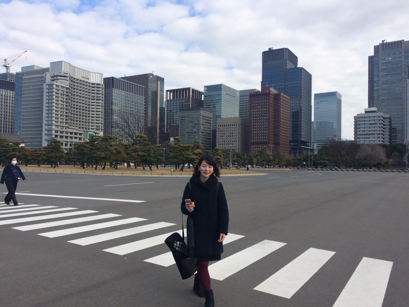 ビルを背景にりょうこちゃん! これから皇居周辺で撮影です!