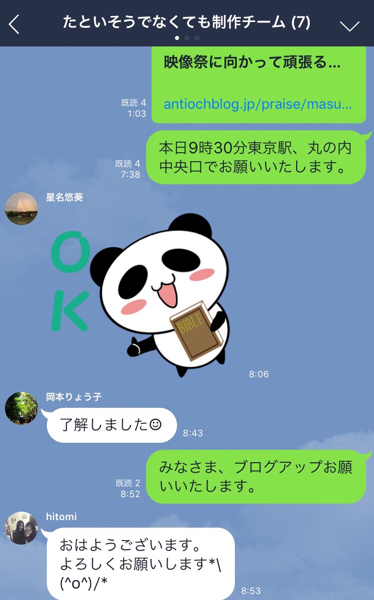 先回のチーム藤井にまねて、ライン連絡をしています。 ちなみにこのチーム、「たといそうでなくても制作チーム」と勝手に命名しました。masukawa