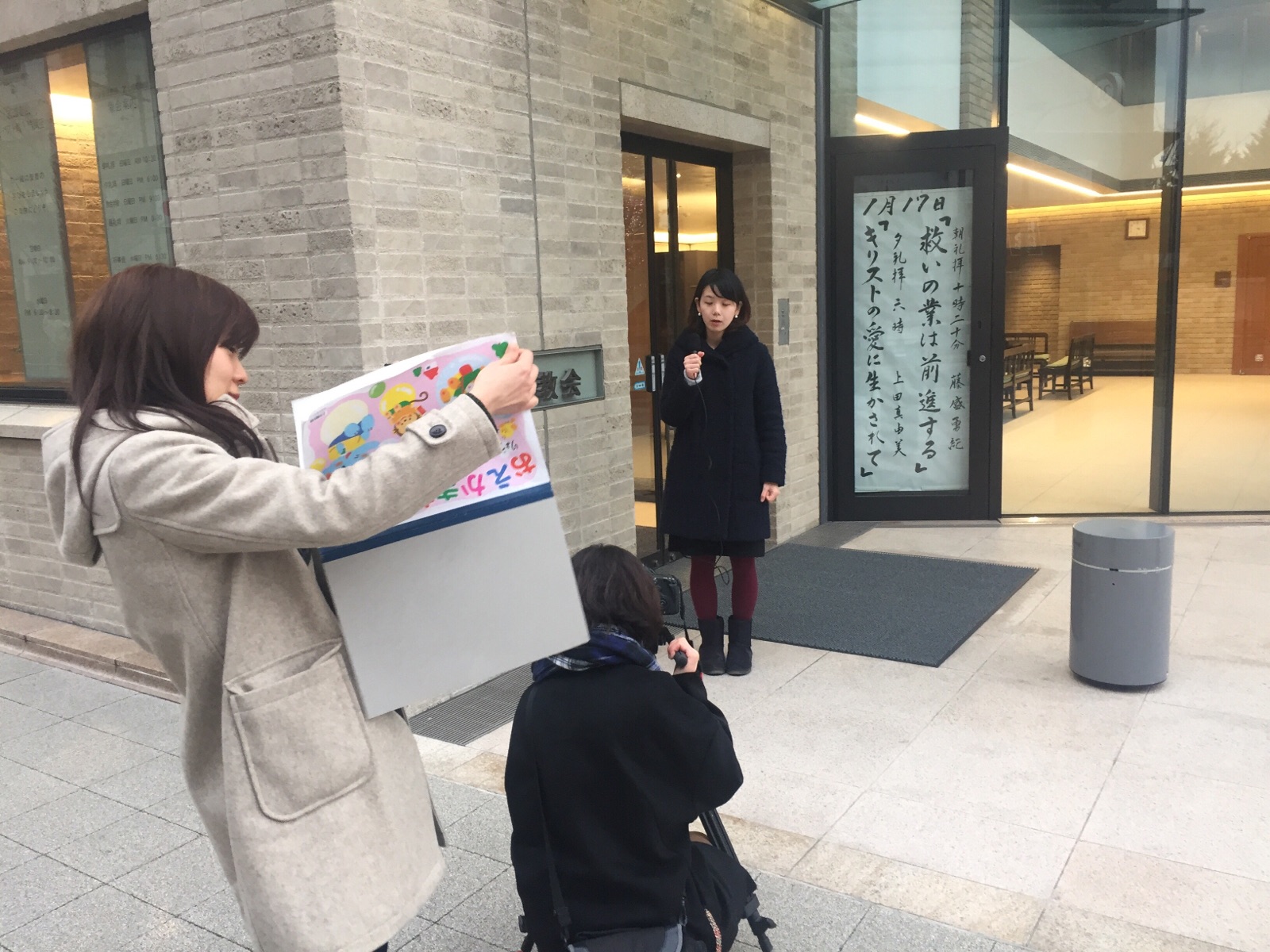 会堂前でりょうこちゃんレポートシーン。