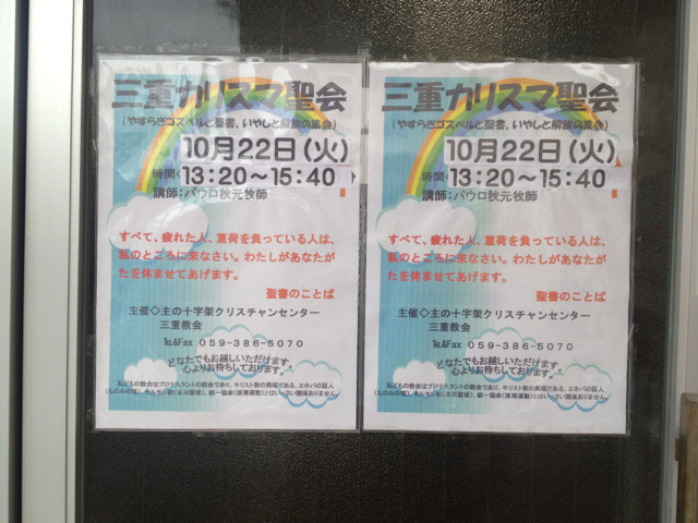 三重カリスマ聖会が、13:20分から白子駅前会館で行なわます! 入り口に綺麗な聖会案内のチラシが貼ってあります。 お待ちしています! 四日市