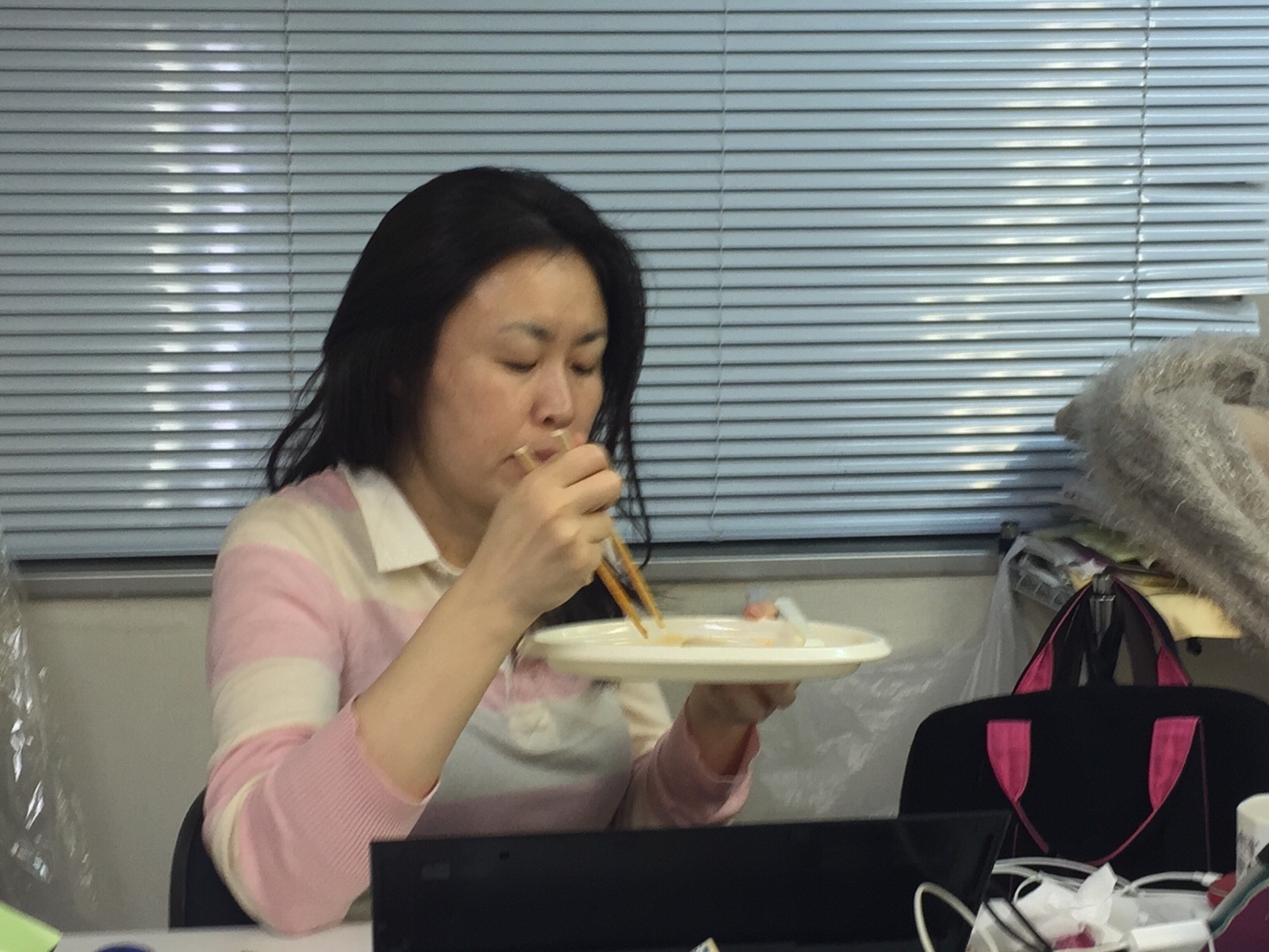 フリースを着た益川さん。お寒いようです。 休憩中。 高倉健さんを見ているのでしょうか。