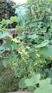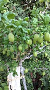 右の写真はグーズベリーと言って、熟しても赤くはなりません。これが食べごろの色なんです。