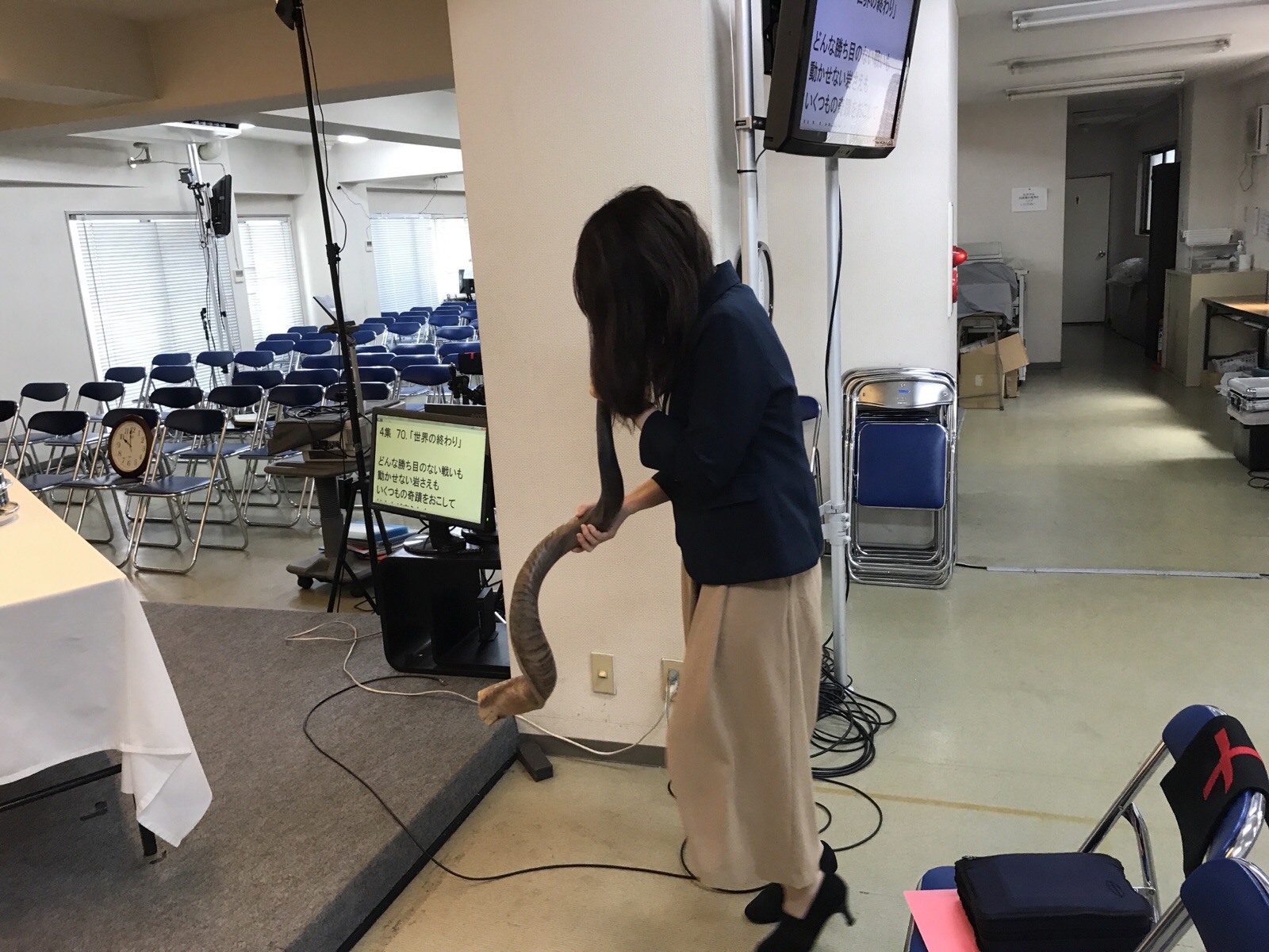 礼拝の前に角笛を持ってみる 吹きませんよ〜と山中さん。 Naomi