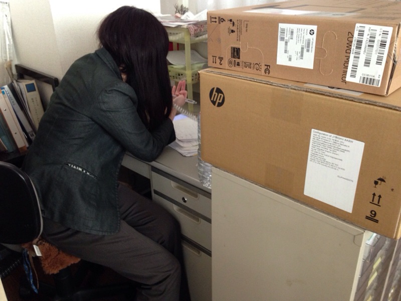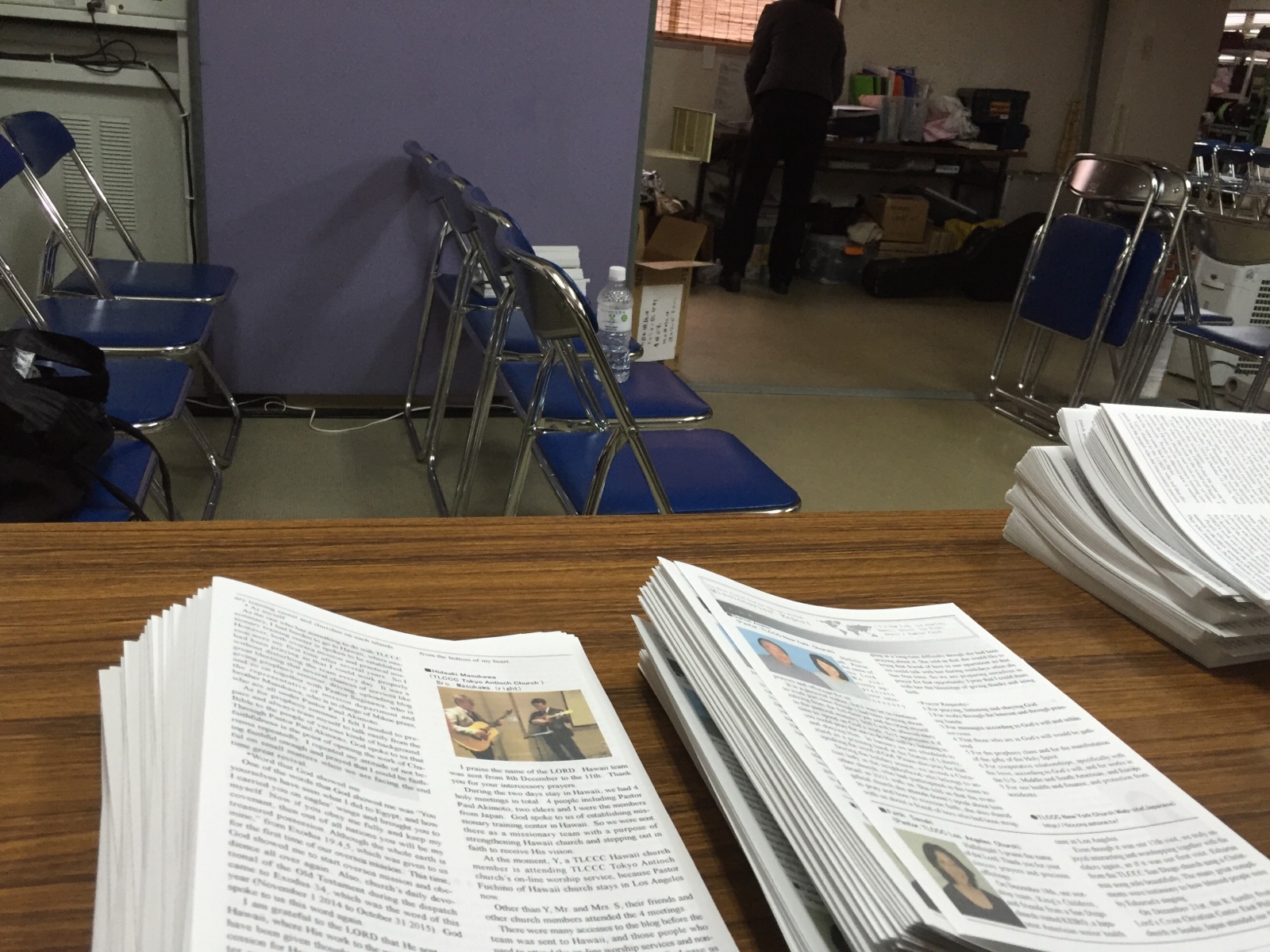 会堂でミッション誌印刷作業中のナオミさん、カンボジのアスカイプ思い出してよかったね(^^) 北米部門oji