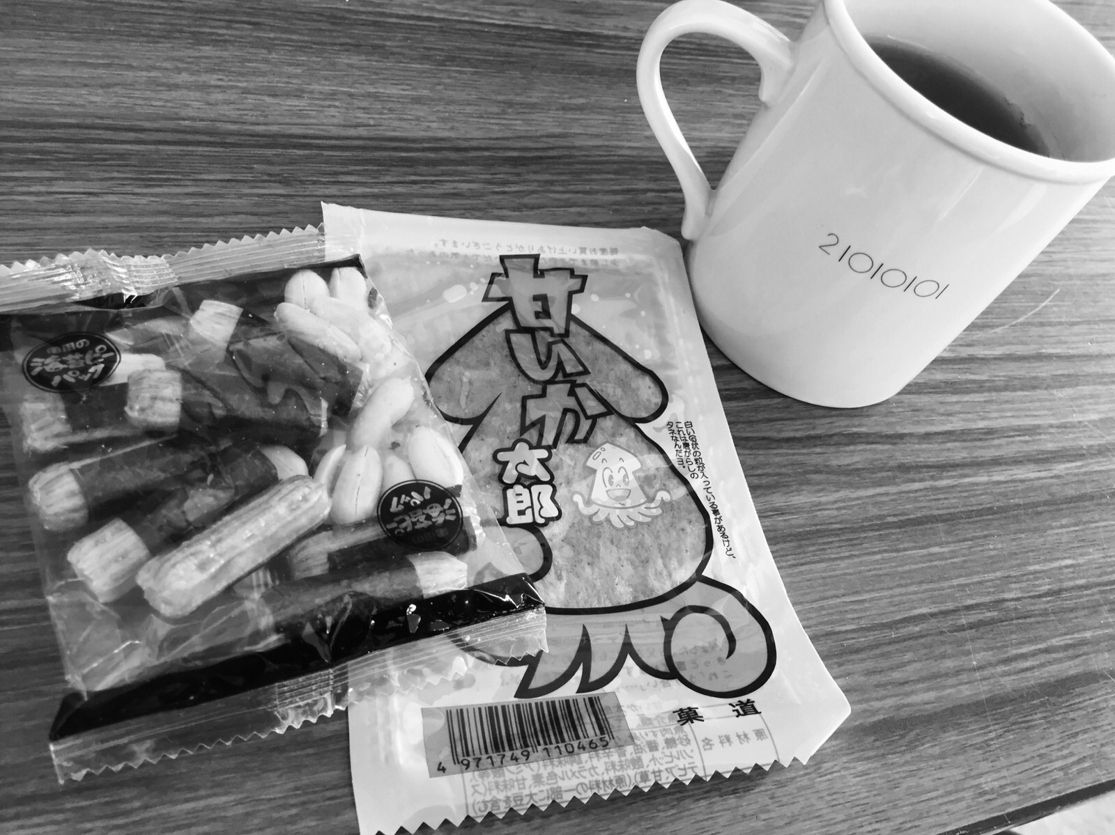 今日のわたしのおやつ。 モノクロにしてみました。 甘いか太郎なつかしい。 ミッションNaomi