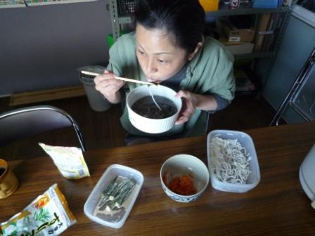 おじろさん、まだお米が炊き上がるまで時間があるので、先に、持ってきたビーフンを食べています。